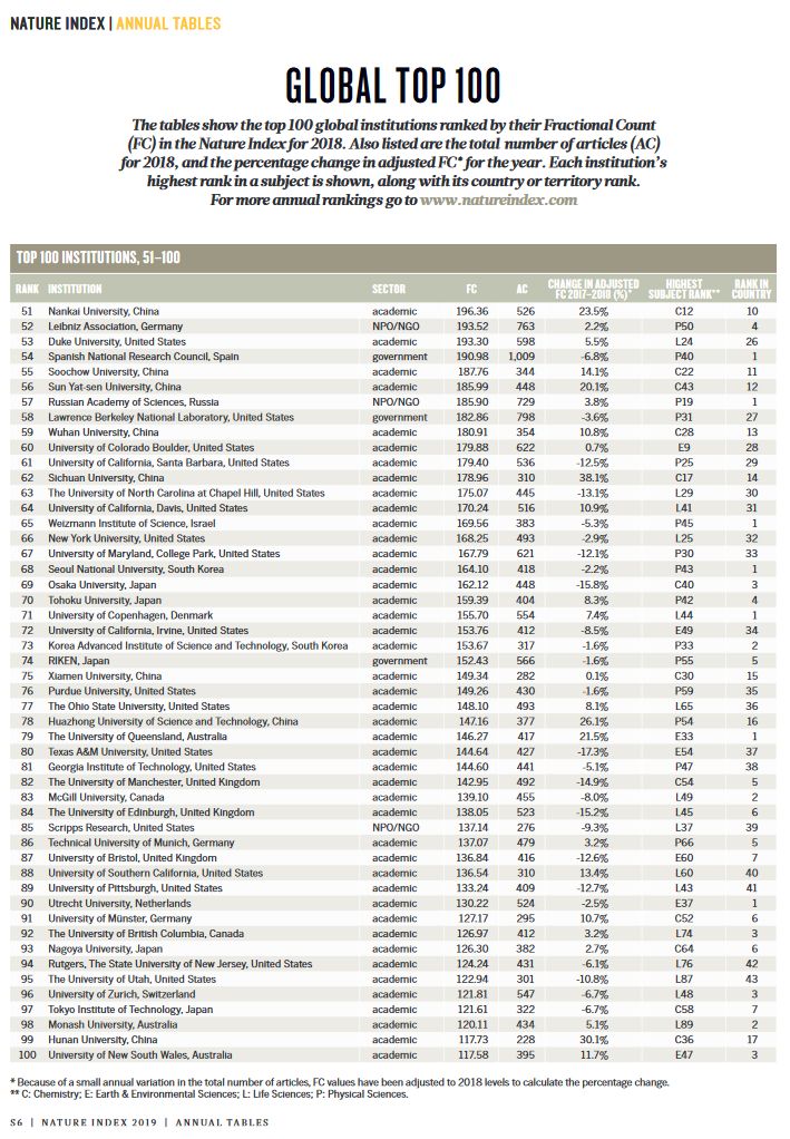 自然指數顯示,根據調整后的2018年分數計量值,排名前十的國家中只有中國和澳大利亞實現了科研產出的正增長。其中,中國十家領先的科研機構為:中國科學院(第1),北京大學(第10),清華大學(第13),南京大學(第15),中國科學技術大學(第17),中國科學院大學(第24),浙江大學(第27),復旦大學(第34),上海交通大學(第41),南開大學(第51)。