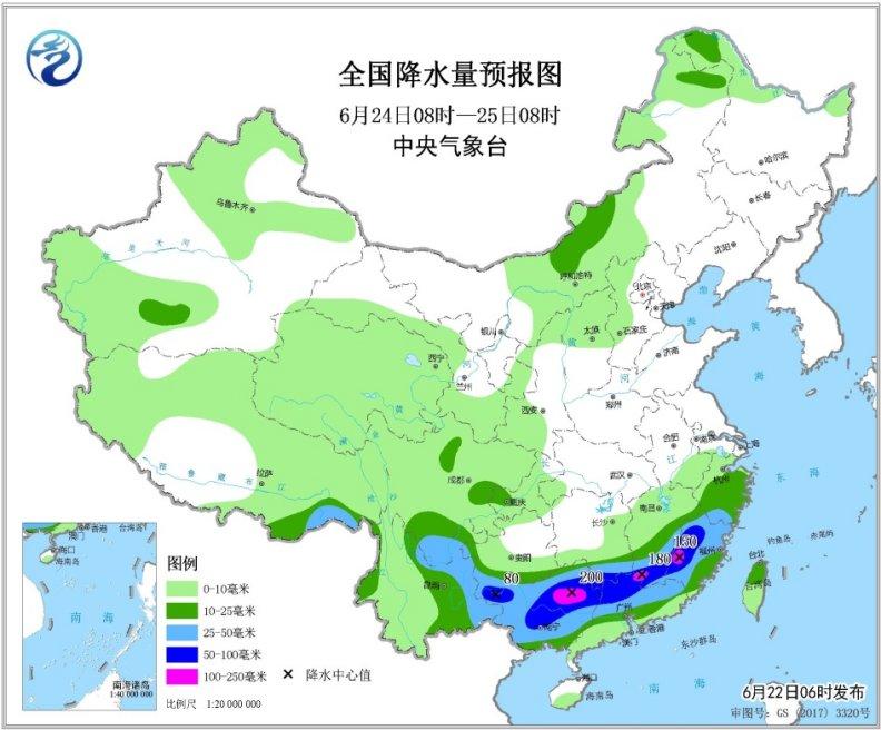 6月24日08時至25日08時,江南南部、廣西大部、廣東中北部、云南東部、貴州西南部等地有大到暴雨,其中廣西東北部、廣東北部、福建西部等地部分地區有大暴雨(100~200毫米)。