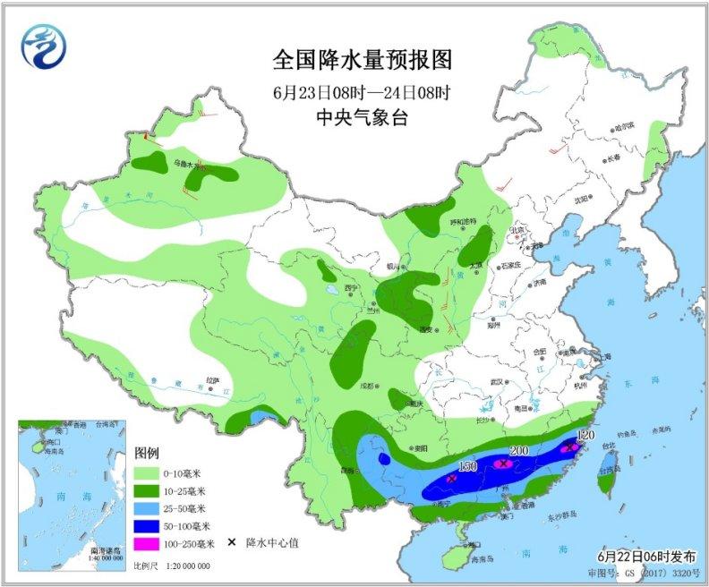6月23日08時至24日08時,江南南部、華南中北部、云南東部、貴州西部、臺灣島北部等地有大到暴雨,其中,福建東部、廣西北部、廣東北部等地部分地區有大暴雨(100~200毫米)。內蒙古中東部、新疆北部、陜西等地部分地區有4~6級風,山口地區有7~8級風。