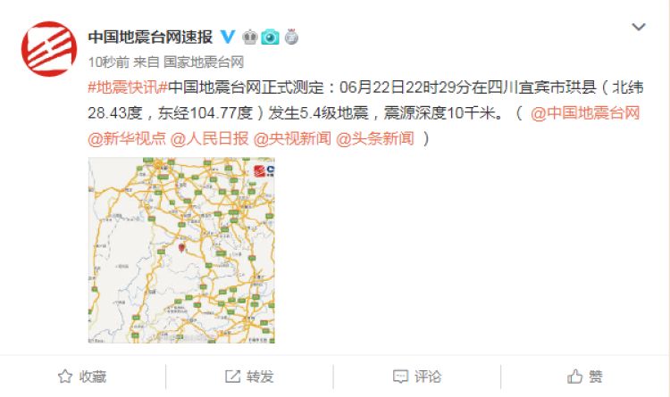 中國地震臺網正式測定:06月22日22時29分在四川宜賓市珙縣(北緯28.43度,東經104.77度)發生5.4級地震,震源深度10千米。