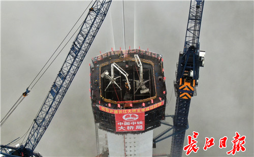 長江日報融媒體6月27日訊 6月27日8時,隨著最后一方混凝土澆筑完畢,由中國鐵路總公司建設(shè)、武漢“建橋國家隊”中鐵大橋院設(shè)計、中鐵大橋局施工的滬通長江大橋南主塔成功封頂。至此,大橋兩座高達330米的主塔全部建成。