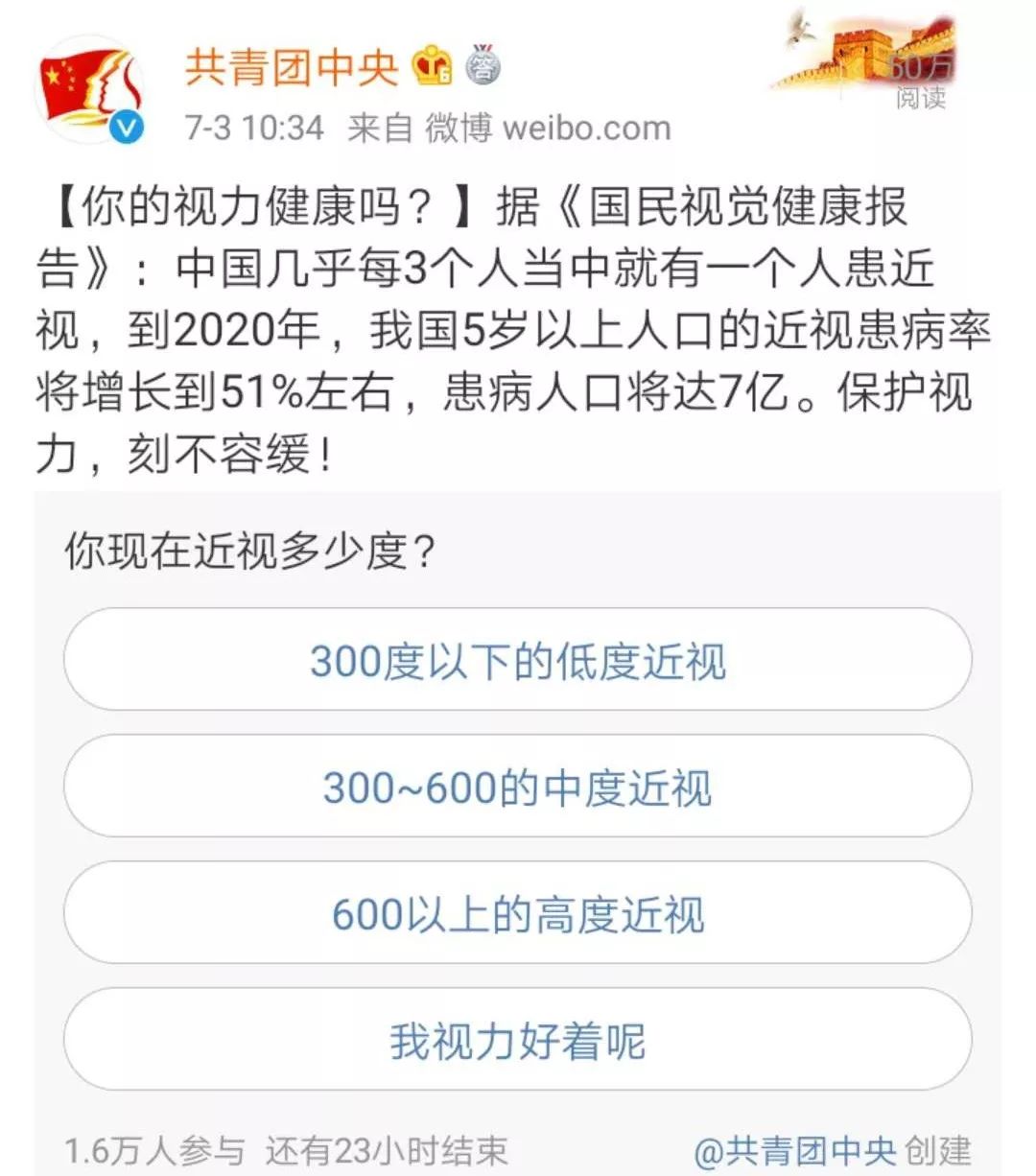 @ 發布了【你的視力健康嗎】調查,截至目前數據,參與本次調查的大多數網友都患有近視,視力健康的比例不到15%。