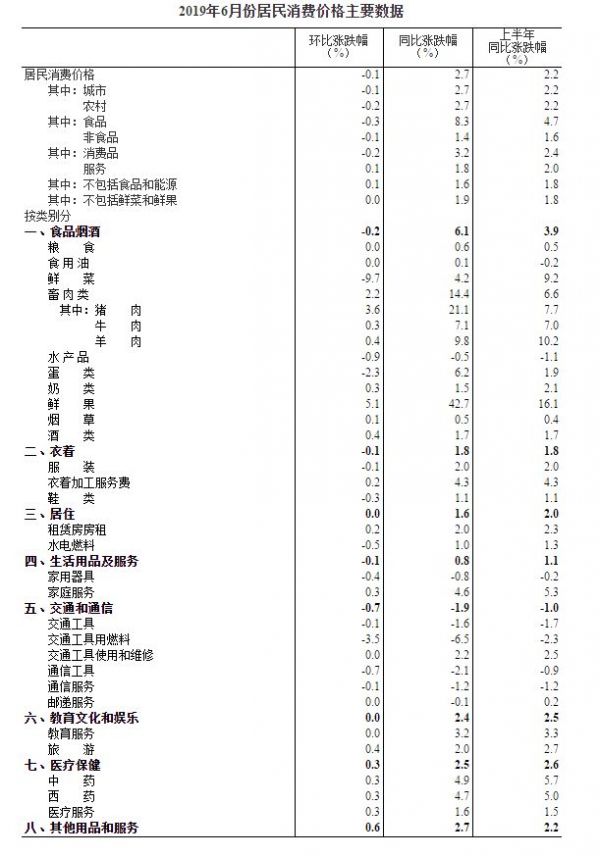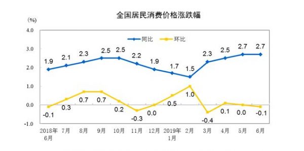 國家統計局今天(7月10日)公布的6月價格指數顯示:全國居民消費價格指數CPI從同比看,上漲2.7%,漲幅與上月相同;從環比看,CPI由上月持平轉為下降0.1%。