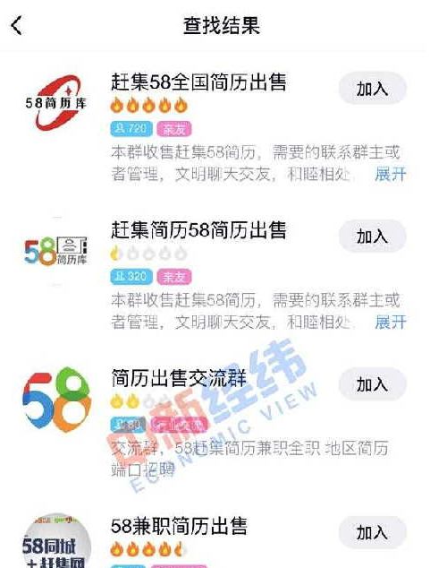 在QQ群查找中以“簡歷出售”為關(guān)鍵詞進行搜索,出現(xiàn)了“趕集58全國簡歷出售”“簡歷出售交流群”“全國簡歷出售回收”等多個疑似簡歷倒賣群。