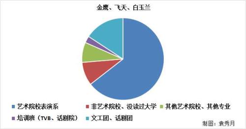 金雞獎(jiǎng)、金像獎(jiǎng)、金馬獎(jiǎng)、金鷹獎(jiǎng)、飛天獎(jiǎng)、白玉蘭獎(jiǎng)過(guò)去十屆獲獎(jiǎng)演員教育經(jīng)歷統(tǒng)計(jì),除去不明以及重復(fù)的,共計(jì)入131位