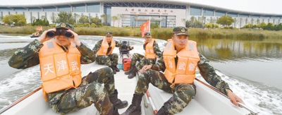 論壇期間,擔(dān)負(fù)安保任務(wù)的武警天津總隊(duì)官兵在會(huì)場(chǎng)外水面巡邏。劉春輝攝