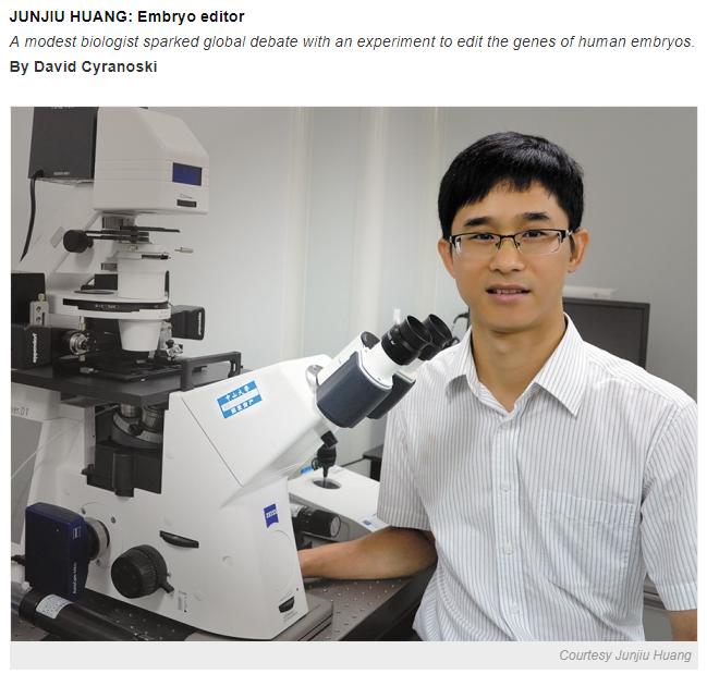 2015年,中山大學(xué)教授黃軍就上榜,黃軍就及其團(tuán)隊(duì)利用基因編輯技術(shù)對人類胚胎的一個(gè)特定基因進(jìn)行修改,從而避免該基因突變導(dǎo)致地中海貧血癥。黃軍就在接受《自然》采訪時(shí)說,這項(xiàng)實(shí)驗(yàn)?zāi)軒椭接懸恍┲卮蠹膊≡诨驅(qū)用娴某梢颍⒂兄谘芯颗咛グl(fā)育過程中基因所發(fā)揮的作用。然而,由于這類實(shí)驗(yàn)涉及學(xué)術(shù)倫理,在獲得關(guān)注的同時(shí)也引發(fā)爭議。例如,盡管黃軍就等人使用的是醫(yī)院丟棄的異常胚胎,其論文發(fā)表后仍引發(fā)科學(xué)界批評。