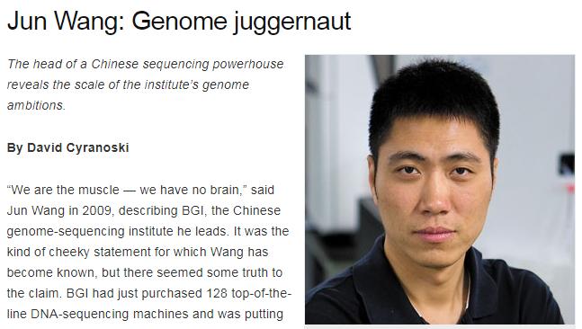 2012年,青年科學(xué)家、時(shí)任中國華大基因CEO的王俊上榜。《自然》雜志援引哈佛大學(xué)遺傳學(xué)家喬治?洽奇的評價(jià)說,1999年,華大基因支持了人類基因組計(jì)劃的1%,而在2012年,華大的基因測序能力,讓其在世界基因測序上的貢獻(xiàn)超出了50%。