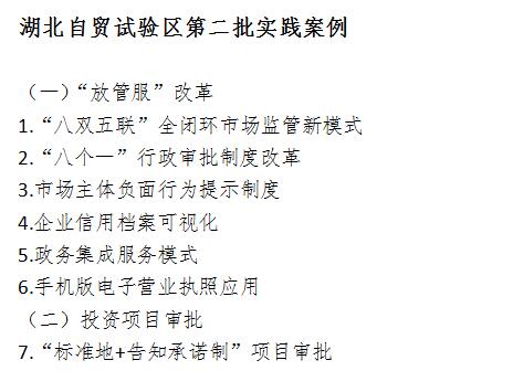 湖北日報訊 (記者艾紅霞 通訊員江暢、黃小俊)大膽試、大膽闖、自主改,自貿區正迸發出源源不斷的改革創新動力。1月9日,湖北自貿區第二批制度創新成果新聞發布會宣布,在省內復制推廣36項成果。至此,在省內復制推廣的制度創新成果達57項,數量居第三批自貿試驗區中名列前茅,多于遼寧(45項)、四川(35項)、重慶(21項)、陜西(18項)(注:河南、浙江尚未發布復制推廣成果)。