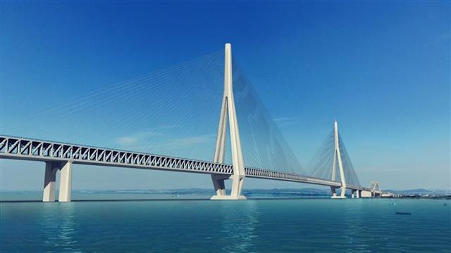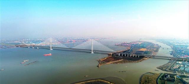 中鐵大橋院總工程師高宗余介紹,常泰過(guò)江通道為公鐵合建橋梁工程,合建段總長(zhǎng)5.3公里。大橋采用“高速公路+城際鐵路+普通公路”方式設(shè)計(jì),其中上層橋面規(guī)劃為6車道高速公路,設(shè)計(jì)速度100公里/小時(shí);下層橋面上游側(cè)規(guī)劃為兩線城際鐵路,設(shè)計(jì)速度200公里/小時(shí);下層橋面下游側(cè)規(guī)劃為4車道一級(jí)公路,設(shè)計(jì)速度80公里/小時(shí)。主航道橋采用主跨1176米斜拉橋,是世界最大跨度斜拉橋;通道的其他兩座航道橋——天星洲航道橋和錄安洲航道橋均采用主跨388米的鋼桁梁拱橋,是世界最大跨度的公鐵兩用鋼拱橋。