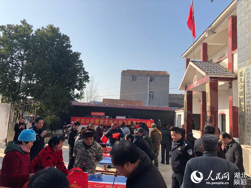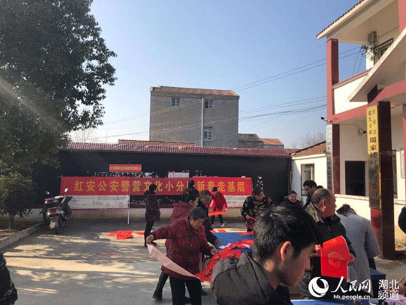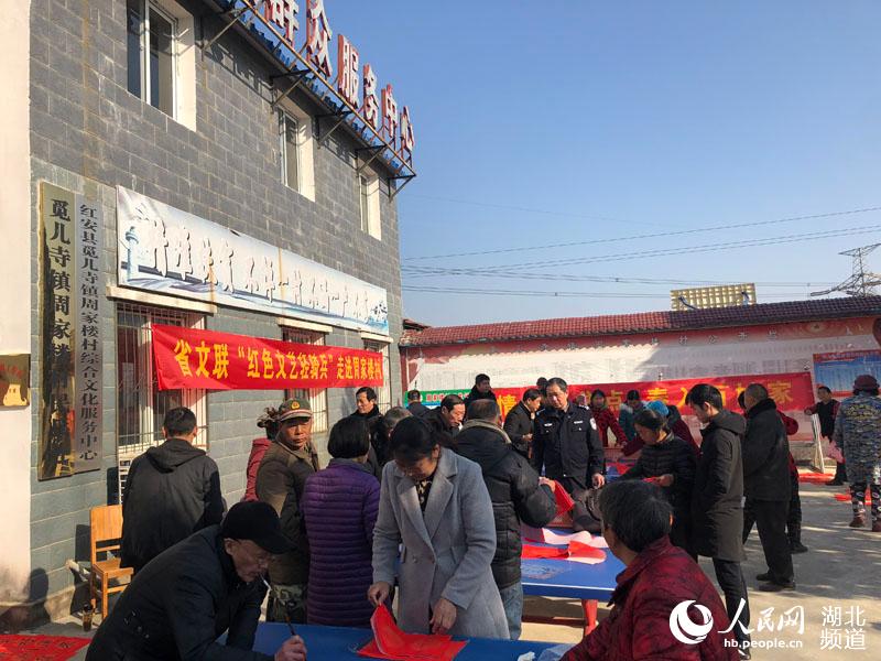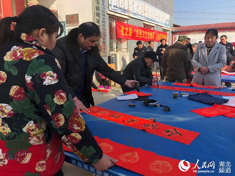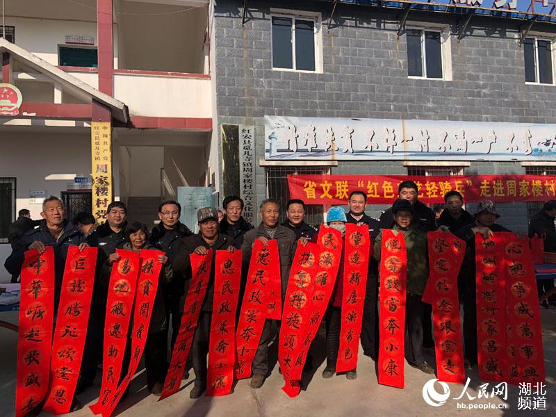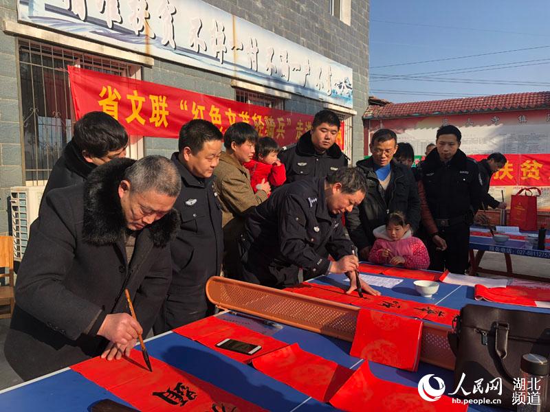 人民網紅安1月24日電 近日,湖北省文聯“紅色文藝輕騎兵”走進紅安縣周家樓村扶貧點寫春聯。“政府兜底保民生,鄉村振興脫貧困”“鄉村振興展新貌,產業扶貧促增收”“扶貧開發顯真情,易地搬遷助民富”“扶貧先扶智,治窮先治愚”“精準精確精到戶、扶貧扶智扶至人”“萬眾一心打好脫貧攻堅戰、千方百計引導精準致富路”……一副副春聯在書法家們揮動的筆下一氣呵成,一副副吉語妙對在村民手中傳遞著。(郭永安)