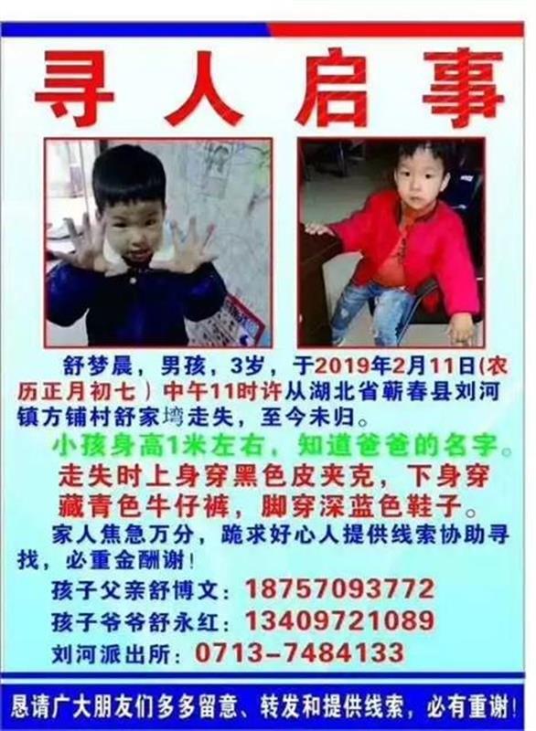 2月11日(正月初七)上午11時許,身高1米的舒夢晨,在自家村莊蘄春縣劉河鎮方鋪村舒家塆走失。“上身穿黑色皮夾克,下身穿藏青色牛仔褲,腳穿深藍色鞋子。”舒博文回憶。