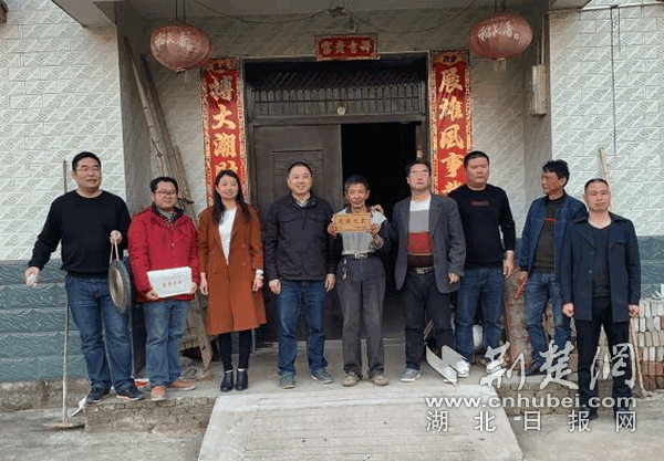 圖為:黃泥畈村干部為現(xiàn)役、退役軍人家中送"光榮之家"牌匾。通訊員陳蘭攝