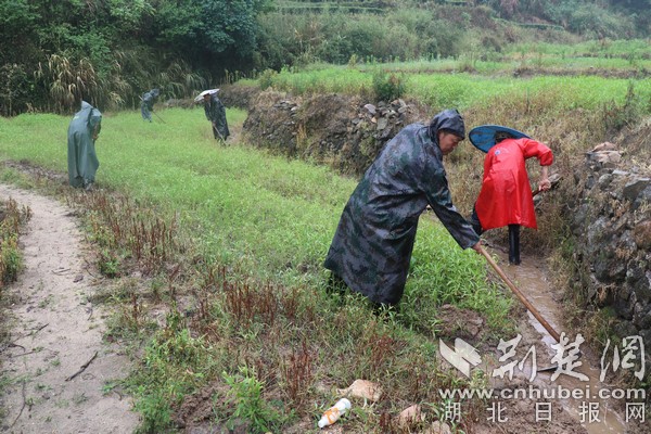 鄭正利帶領村民冒雨在新發展的黃金芽茶葉基地清溝(通訊員 劉釗海 攝)