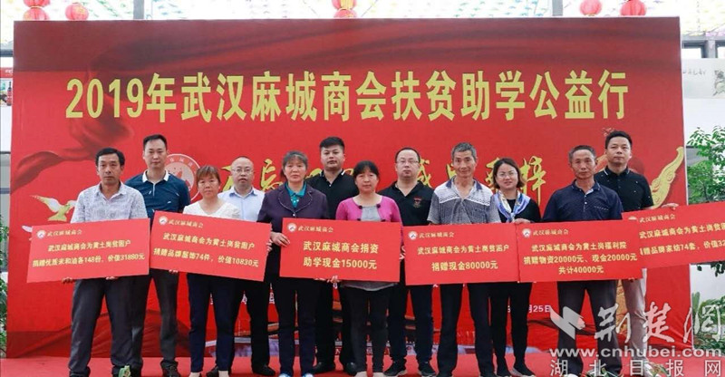 荊楚網客戶端-荊楚網消息(通訊員 王喜麗)5月25日,來自武漢麻城促進會負責人、武漢麻城商會會員共100余人,來到黃土崗鎮舉行"2019年武漢麻城商會扶貧助學公益行"活動,捐資近21萬元幫助當地貧困居民解決生活困難。