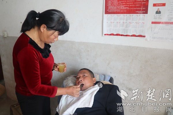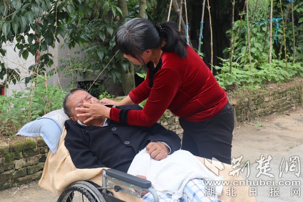 荊楚網客戶端一荊楚網消息(通訊員劉釗海 余志敏)6月9日一大早,英山縣溫泉鎮山溪坳村九組的余巍,象往日一樣,吃力地將55歲的丈夫陳志勇,從床上抱到輪椅里,把手腳牽直,將弄皺的衣服輕輕撫平,然后給陳志勇漱口、洗臉,喂水、喂飯。