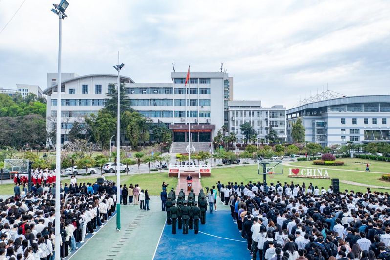 6時50分,伴著旭日晨光,國旗班邁著整齊堅定的步伐護送國旗走向升旗臺。在雄壯的國歌聲中,五星紅旗冉冉升起,現場全體師生高唱國歌、行注目禮,深情表達著對偉大祖國的熱愛和對母校生日的祝福。