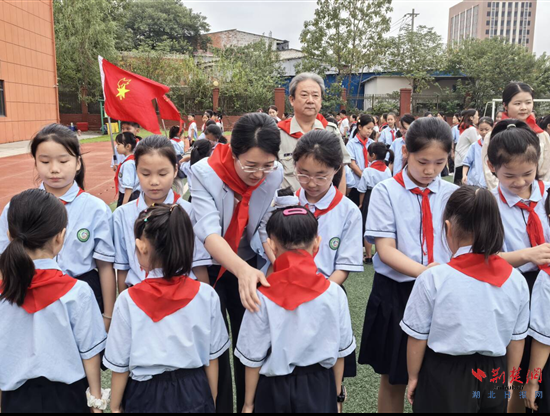 老隊員代表為新隊員佩戴上期盼已久的紅領巾。新老隊員互敬隊禮,象征著紅色精神的傳承。在大隊輔導員周聰的帶領下,新隊員進行了莊嚴的入隊宣誓,老隊員重溫了入隊誓詞,錚錚誓言在校園內回蕩,表達了隊員們聽黨話、跟黨走,為共產主義事業貢獻力量的堅定決心。