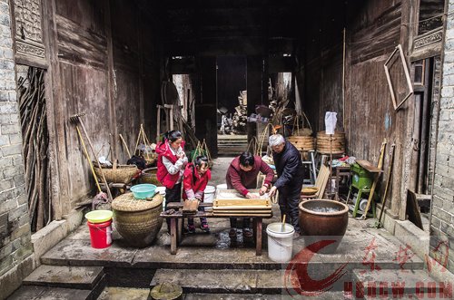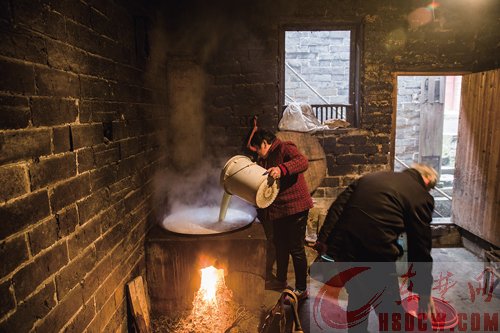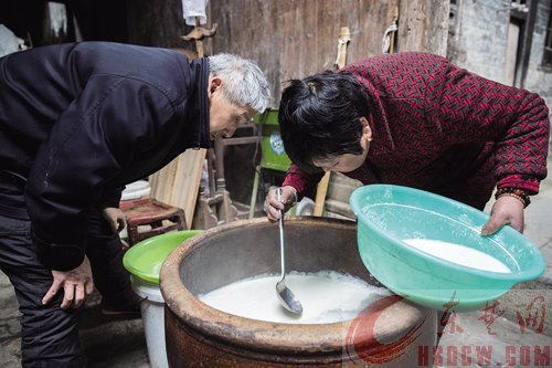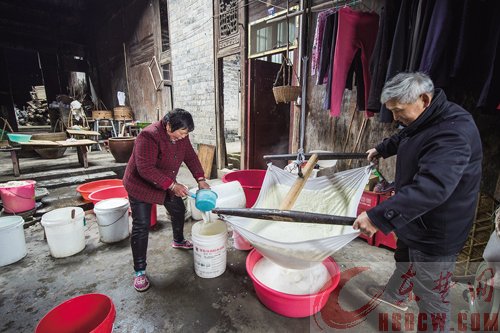 農(nóng)歷臘月二十六一大早,坳上村一幢有著近200年歷史的老房子里,有人已經(jīng)忙碌起來(lái),村民翟桃花和老伴正張羅著做豆腐的工具和原材料。
