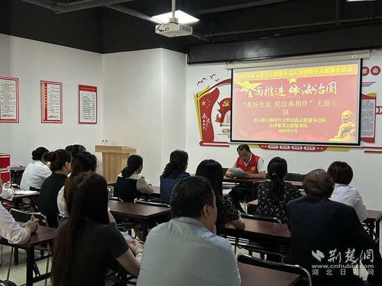 荊楚網(湖北日報網)訊(通訊員 沈吉祥)今年5月是第四個“民法典宣傳月”。5月16日下午,黃石港區法律服務志愿服務隊開展民法典主題宣講活動,邀請萬達社區居民、物業代表等50余人參加宣講活動。