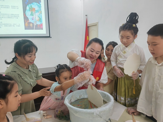 活動(dòng)現(xiàn)場(chǎng),黃石市圖書(shū)館志愿者給大家展示了非遺漂漆扇制作需要的素材、工藝及大漆的起源,并通過(guò)手把手操作,讓青少年感受漂漆工藝過(guò)程:滴漆-攪漆-漂染-出畫(huà)。