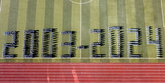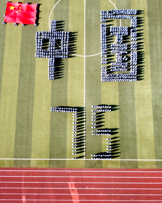 分列方陣的檢閱結束后,擺字方陣伴隨悠揚的音樂變換隊形,用精準的動作歌頌偉大祖國,給現場師生帶來精彩的視覺盛宴。