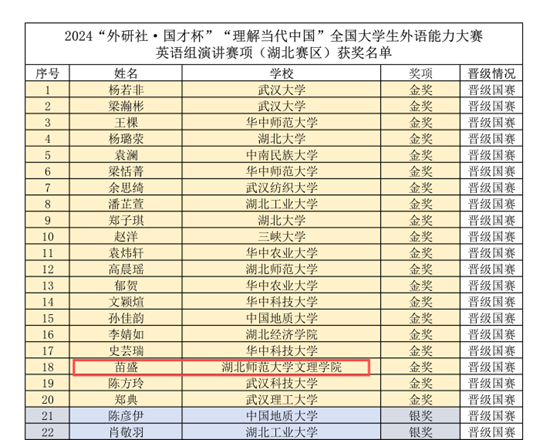 荊楚網(湖北日報網)訊(記者呂鑒蕾 通訊員 鄧薇薇 王婉馨)記者14日從湖北師范大學文理學院獲悉,在2024年“外研社·國才杯”“理解當代中國”全國大學生外語能力大賽(湖北賽區(qū))決賽中,該校學生以出色的表現(xiàn)榮獲“英語演講”賽項一金一銅的優(yōu)異成績。其中,榮獲金獎的苗盛同學是湖北省所有民辦高校唯一的晉級國賽的選手,創(chuàng)造了民辦高校的“第一次”。