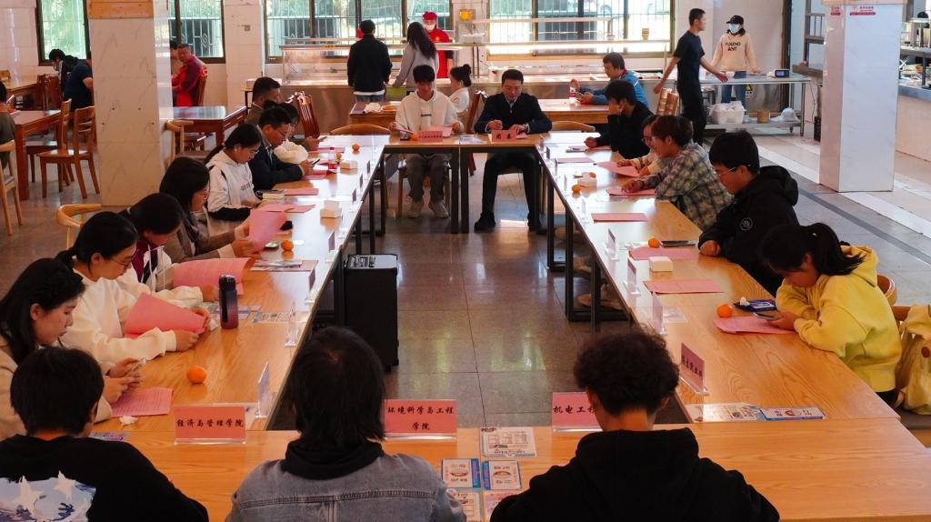 在輕松愉悅的用餐過程中,來自各學院的學生代表們依次發言,分享著在學校的所學、所想與所惑。“對于有創業意向的同學,學校是否有針對創業項目從構思到落地的實操性指導課程?”機電學院的郭志磊同學問道。土木建筑工程學院的胡懷宇同學表示,“希望學校能增加第二課堂政治覺悟、創新創業板塊的學分供給”。
