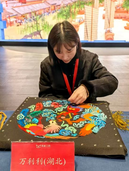 今年40歲的萬利利出生于湖北陽新,她自幼因病喪失聽覺,經鑒定為“多重一級”殘疾人。2016年,在朋友的介紹下,萬利利進入剛成立的湖北鴻運工藝品股份有限公司,開始學習陽新布貼傳統技藝。通過刻苦鉆研,她僅僅花了三個月的時間,就基本掌握了陽新布貼制作流程,能獨立完成多種陽新布貼作品。經過長期不懈努力,萬利利的作品多次出現在手工技能大賽中,并大放異彩。