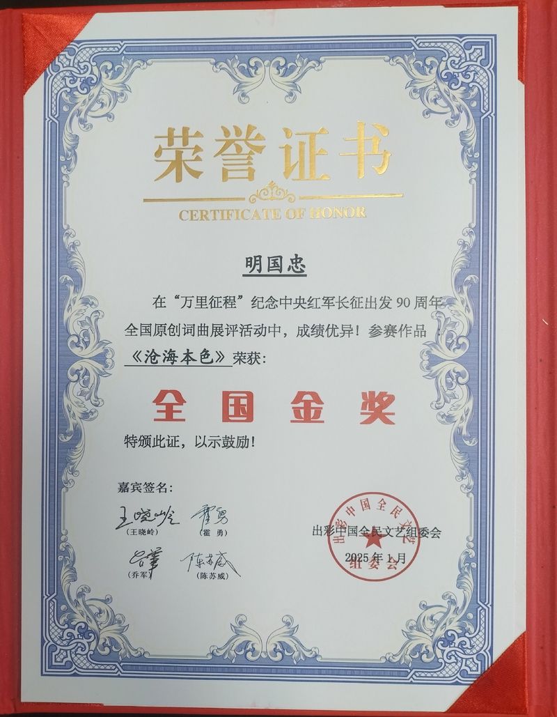 《滄海本色》是明國忠去年6月份創作的,12月份送京參評。由于歌詞文筆優美,貼近時代脈搏,弘揚社會正能量,獲得評委們的一致好評,該作品在今年元月的評審會上脫穎而出,獲得“全國金獎”,這也是此次歌詞評選的最高獎項。