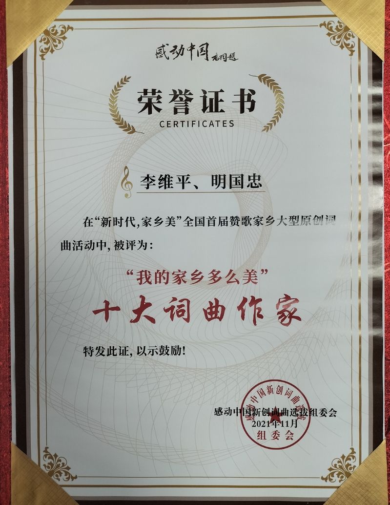 令明國忠沒想到的是,這首《高溪水》一舉成名,在2021年“感動中國——我的家鄉多么美”原創詞曲評選活動中,獲得“十大詞作家”的美譽。《高溪水》由知名曲作家李維平作曲,如今已在社會上流傳開來。