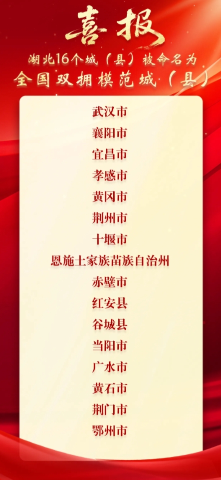 值得一提的是,除了黃石市,今年湖北受國家命名表彰的“雙擁模范城”(縣)的還有武漢市、襄陽市、宜昌市、孝感市、黃岡市、荊州市、十堰市、恩施土家族苗族自治州、赤壁市、紅安縣、谷城縣、當陽市、廣水市、荊門市、鄂州市,合計16個城(縣)。