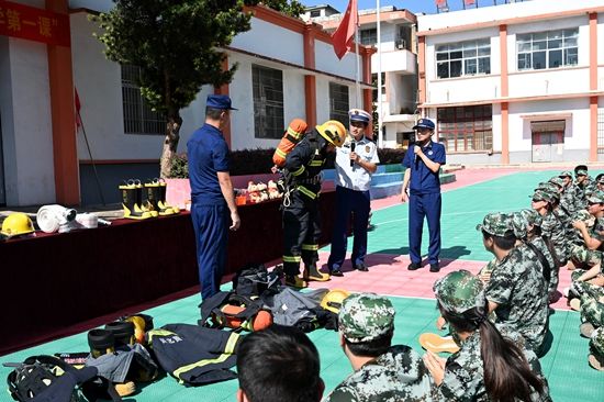 在籃球場,鐵山區消防救援大隊的消防員們展示了水帶連接、拋灑和持槍射水等動作要領。學生們分組體驗,在消防員指導下完成整套流程。戰斗服穿戴體驗環節,新生們踴躍參與,親身體驗了消防員戰斗服的重量與厚重感,深刻體會消防員負重作戰的艱辛。