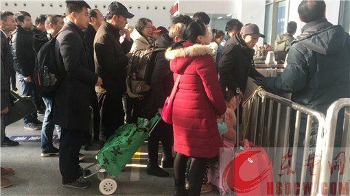 昨日是春運第二天,上午9時許,東楚晚報記者來到黃石北站。進站口通道處,乘客已排起了長隊,依次刷身份證進站。黃石北站候車廳內座椅上坐滿了乘客,進站閘機處也排起了長龍。