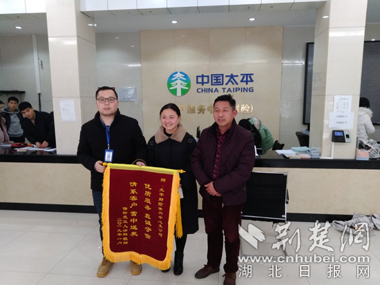 荊楚網(wǎng)客戶端-荊楚網(wǎng)消息(通訊員施丹)近日,太平財(cái)險黃岡中支職場來了兩位陌生客戶,他們拿著錦旗徑直來到理賠辦公室,拉著查勘員阮聆桓的手,激動地說:“感謝你們太平財(cái)險,感謝你解決了我們的燃眉之急!”小阮紅著臉靦腆地說:“這都是我們應(yīng)該做的。”