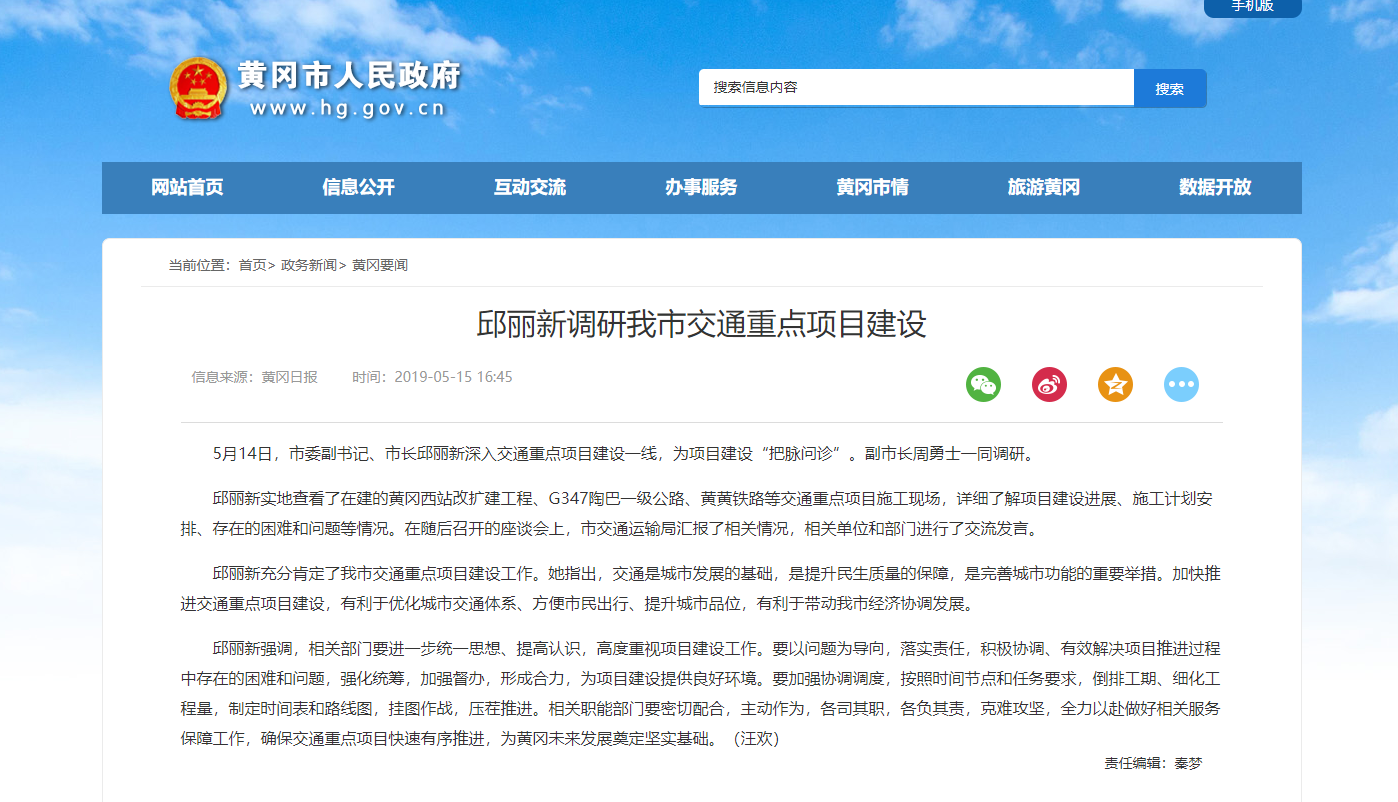 邱麗新實地查看了在建的黃岡西站改擴建工程、G347陶巴一級公路、黃黃鐵路等交通重點項目施工現場,詳細了解項目建設進展、施工計劃安排、存在的困難和問題等情況。在隨后召開的座談會上,市交通運輸局匯報了相關情況,相關單位和部門進行了交流發言。