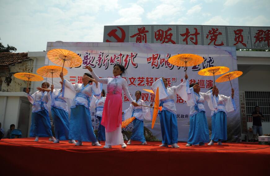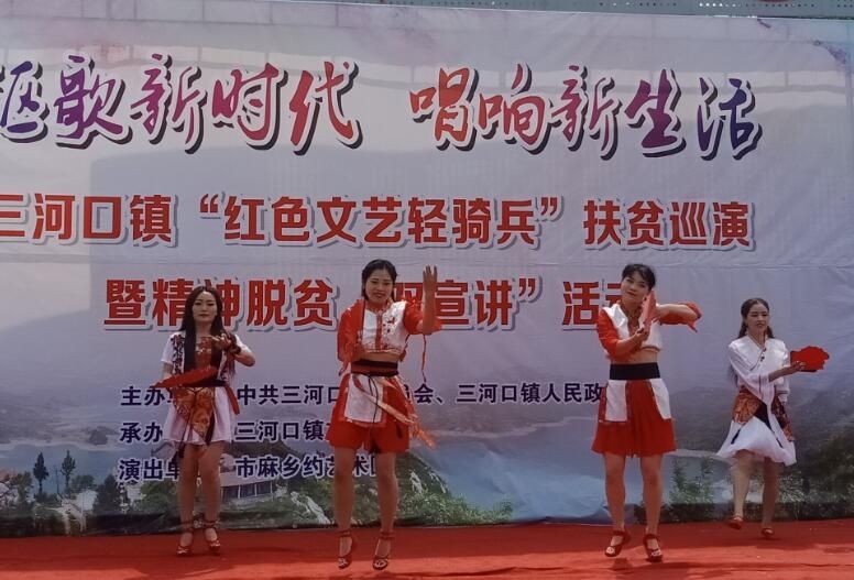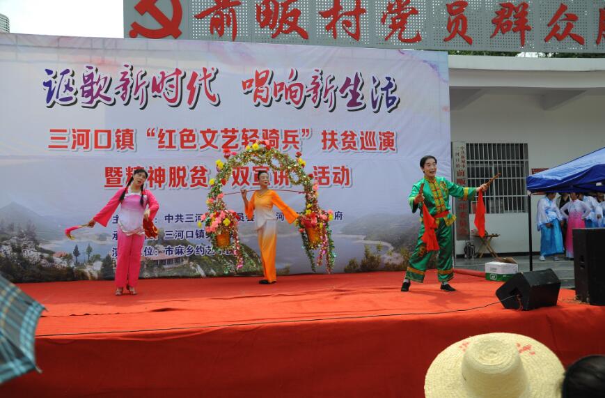 本次扶貧巡演暨精神脫貧“雙宣講”活動(dòng),由中共三河口鎮(zhèn)黨委、三河口鎮(zhèn)政府主辦,三河口鎮(zhèn)文化站承辦。演出單位為來自麻城市的麻鄉(xiāng)約藝術(shù)團(tuán)。專業(yè)文藝工作者帶來的歌舞、戲曲、雜技等十多個(gè)節(jié)目,伴以前畈村婦女舞蹈隊(duì)的聯(lián)箱舞、花傘舞、廣場(chǎng)舞,精彩表演,精彩紛呈,現(xiàn)場(chǎng)300余名觀眾,不時(shí)報(bào)以熱烈的掌聲。