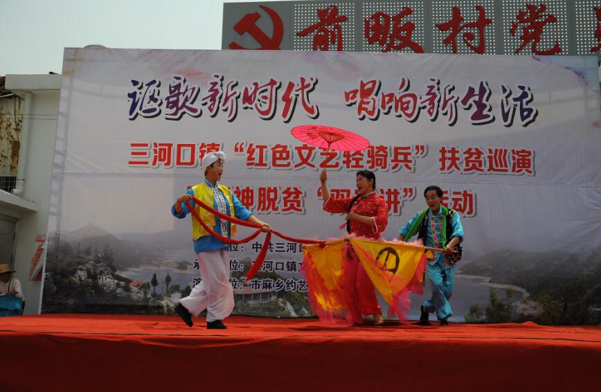 上午9點(diǎn),村黨員群眾服務(wù)中心門前,人頭攢動(dòng),熱鬧非凡。這里是三河口鎮(zhèn)“紅色文藝輕騎兵”扶貧巡演暨精神脫貧“雙宣講”活動(dòng)現(xiàn)場(chǎng)。