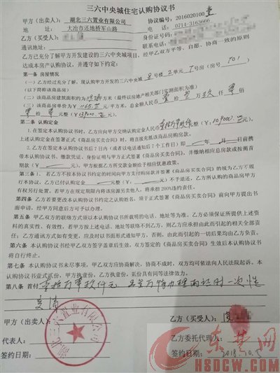 東楚晚報(bào)記者看到,陳女士和鄔女士所稱的購(gòu)房合同是“三六中央城住宅認(rèn)購(gòu)協(xié)議書(shū)”。
