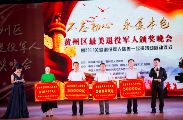 晚會按照湖北省開展2019年關愛退役軍人“慈善一起捐”活動要求,現場啟動了黃州區2019年關愛退役軍人“慈善一起捐”活動。活動得到了工商銀行黃岡黃州支行、黃商集團、正茂集團、美年大健康的捐款及贊助,在場觀眾也紛紛拿出手機掃碼宣傳資料上的二維碼助力捐贈活動?!按壬埔黄鹁琛彼I善款將注入本級“退役軍人關愛基金”,用于開展困難退役軍人及其他優撫對象的關愛幫扶活動。