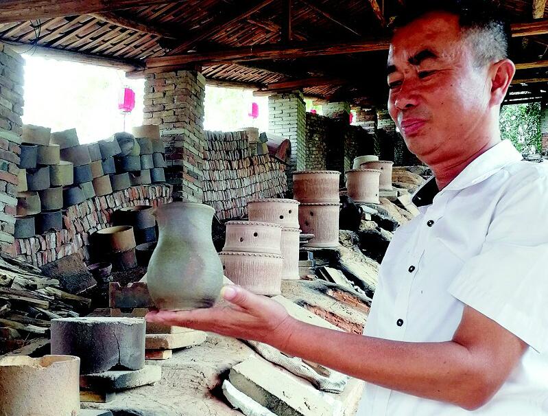 圖為:嵐頭磯工藝陶器廠廠長李普法展示剛剛燒制好的陶器。