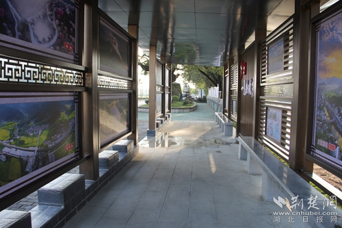 從中門(mén)步入長(zhǎng)廊,迎面“窗欞”上便是那句令人親切無(wú)比的“羅田,一見(jiàn)如故鄉(xiāng)”。左右延展,“春觀百花,夏享清涼,秋觀五彩,冬沐暖湯”“園林城——鳳城倩影,秀美鄉(xiāng)——古鎮(zhèn)新貌”六幅山水畫(huà)便是羅田一年四季和美麗城鄉(xiāng)的真實(shí)寫(xiě)照。轉(zhuǎn)身回眸,春之路、夏之路、秋之路、冬之路,富民路、旅游路、文化路、產(chǎn)業(yè)路,羅田特色農(nóng)村公路躍然畫(huà)上。