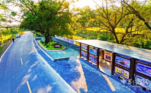 書(shū)香路起點(diǎn)——楓樹(shù)灣,便是一處“微景觀”。“青瓦白墻”仿古式的宣傳欄前草青樹(shù)綠,兩側(cè)各六個(gè)輪胎鑲嵌在“院墻”之中,“建設(shè)好、管理好、養(yǎng)護(hù)好、運(yùn)營(yíng)好”12個(gè)紅色大字鮮艷奪目。憑欄極目,兩河交匯,水清沙白,天高云淡;閉目凝思,那源遠(yuǎn)流長(zhǎng)的歷史、博大精深的文化,悠然蕩漾于心中。