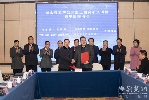 據了解,此次簽約中,中豬(杭州)農業科技有限公司夢享豬豬?國際牧場浠水縣現代農業產業園項目協議投資額25億元,廣西禾美生態農業股份有限公司預制食材供應鏈產業園項目協議投資總額5億元,湖北浠寶農業科技發展有限公司油茶產業發展項目協議投資額3億元。