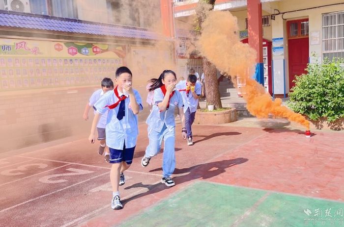 第二次警報響起后,各班教師立即組織全體學生雙手護住頭部,用濕毛巾捂住口鼻,彎腰低身,沿著安全路線快速、有序地疏散到室外安全空曠操場,隨后各班老師立刻清點人員,檢查是否有受傷學生并向總指揮匯報人數,確保參加演練的全部人員無一疏漏。