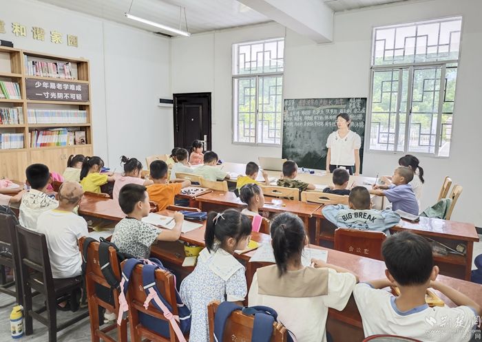 窗外烈日炎炎,室內涼風拂面。月山廟村“幸福驛站”新改造的3間教室里,留守兒童按年齡大小編成3個班,正在同步上課。小班的繪畫課上,小朋友們在志愿服務老師指導下,揮動手中的畫筆,為自己的作品鮮艷上色。中班的音樂課上,琴聲悠揚悅耳,學生齊聲歡唱,展現陽光積極向上。大班的自然科學課上,老師用投影儀講解自然科學知識,小朋友們積極回答問題,與老師交流互動,課堂生動形象,氣氛十分融洽。