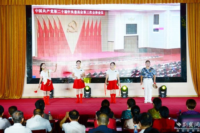 建新社區(qū)群眾代表用質(zhì)樸的語言分享了學(xué)習(xí)貫徹黨的二十屆三中全會精神的心得體會和在黨的堅(jiān)強(qiáng)領(lǐng)導(dǎo)下建新社區(qū)翻天覆地的巨大變化與社區(qū)居民幸福美好的新生活。紅色故事《永不磨滅的“地質(zhì)之光”——李四光》則表達(dá)了對這位從黃岡這片紅色土地走出去的杰出地質(zhì)學(xué)家的無限懷念。氣勢磅礴大合唱《沒有共產(chǎn)黨就沒有新中國》將演出推向了高潮。