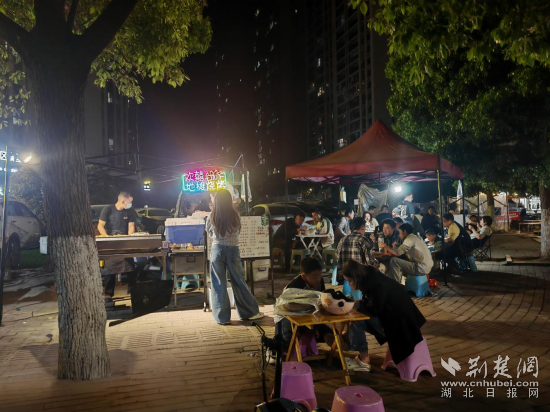 大排檔前的停車位上,各種車輛一字排開,小麗在飯桌上跑堂:“每天都是這樣,桌桌都是宴席,忙都忙不過來。” 在一家火鍋大排檔前,美女主播點開手機,紅紅的湯,歡笑的吃客,線上線下的熱鬧在此刻匯集。住在附近的年輕媽媽牽著孩子在這里漫步:“這里什么好吃的都有,我們下班了,帶小孩出來轉轉,成了習慣。”來自江西的游客則感嘆黃州小吃如何有特色,價格實惠。