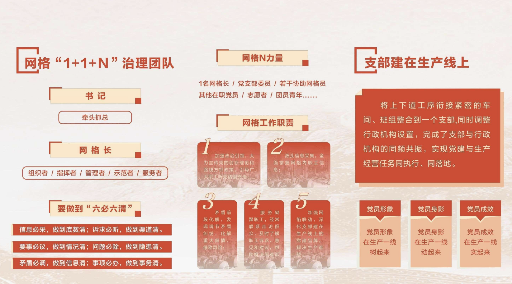 各黨支部將黨建任務與網格內的生產經營指標捆綁下達、一體考核,推動黨員在網格內成為攻堅克難的“主心骨”...