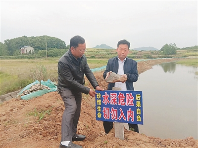 樂祖林(右)在給稻蝦養(yǎng)殖基地樹安全警示牌。李多輝供圖